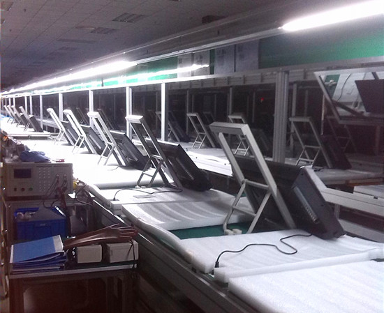連云港客戶的電視機生產(chǎn)線項目于今年四月份完成投入生產(chǎn),整套生產(chǎn)線總長達三百多米,包含了電視機生產(chǎn)加工過程的組裝、老化、測試、修理以及包裝等全部工序。每條生產(chǎn)線設計的可容納工人同時在線工作人數(shù)在40~45。每條生產(chǎn)線加工的電視機產(chǎn)量為小電視每小時150臺;大電視每小時80臺。